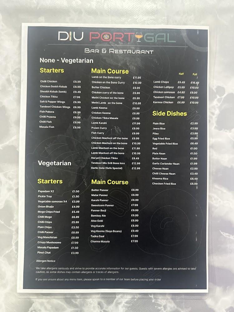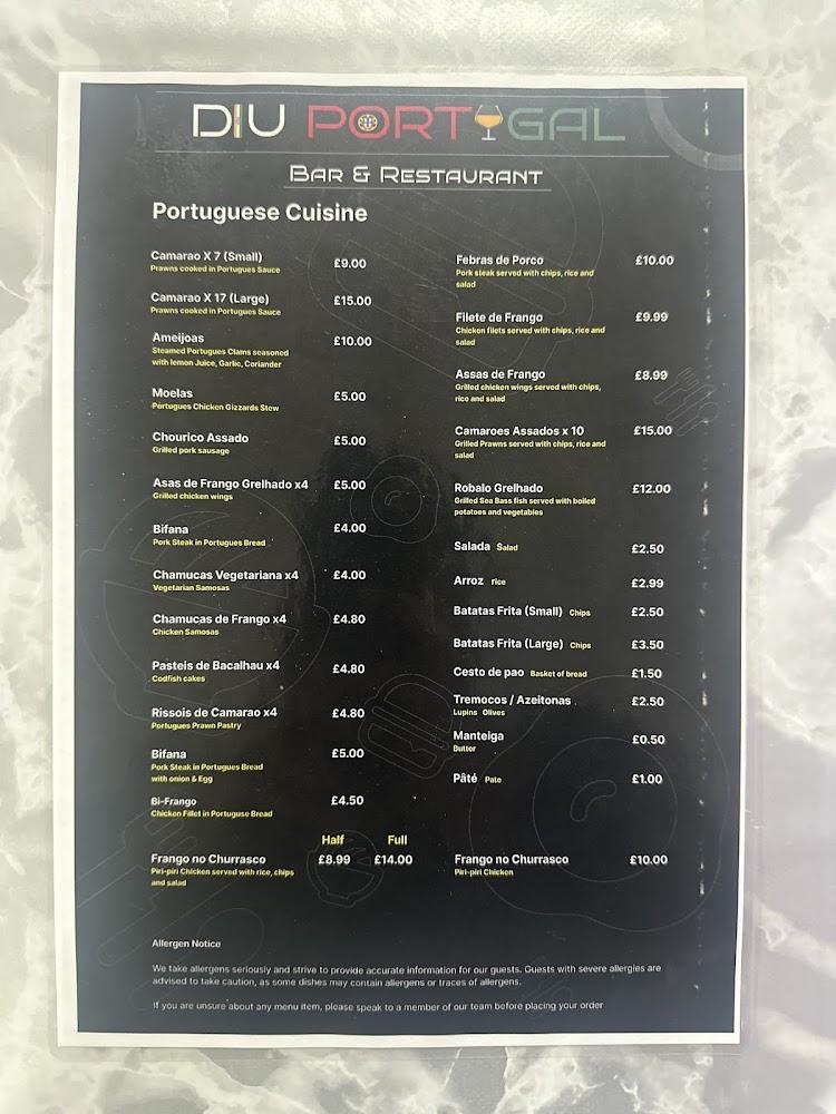 Nestled in the heart of Leicester, Diu Portugal Bar & Restaurant offers a unique dining experience that reflects the charm of Portuguese culture blended with the warmth of Indian hospitality. The location at 270a Loughborough Rd is easily accessible, with free street parking ensuring a hassle-free visit. This restaurant stands out not just for its food, but also for its inviting atmosphere where groups can gather over a hearty meal. The casual vibe creates a welcoming space for everyone, whether you're enjoying a quiet dinner or having a lively night with friends. Diu emphasizes creating memorable moments through its attentive service and home-style cooking. It's a hidden gem for those who appreciate authentic flavors without breaking the bank. The dedicated staff ensures each guest feels valued, aiming for a dining experience that exceeds expectations. The combination of Portuguese and Indian culinary traditions allows diners to explore a diverse menu, making it a popular spot for adventurous eaters in Leicester.